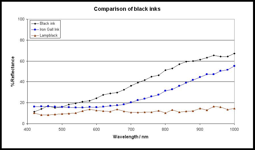 These reflectance spectra may be compared with the spectra of standard pigments. In Fig. 3, it is clear that lampblack (carbon) alone can be ruled out as the black pigment, and that the spectrum of the black ink is more similar to the spectrum of iron gall ink. The identification is not conclusive: differences may be due to the age of the Codex and different methods of preparation. It is also possible that the ink contains some carbon as well as iron gall ink.